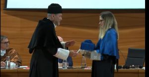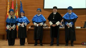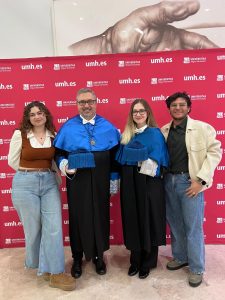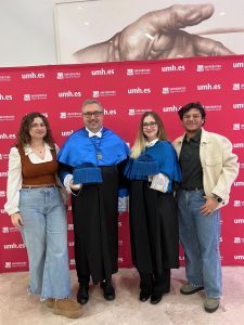 Entre ellos se encontraban los egresados del programa de Doctorado en Biotecnología Sanitaria del Instituto de Investigación, Desarrollo e Innovación en Biotecnología Sanitaria de Elche (IDiBE): Julio Salazar, Ángela Lamberti y Rocío Díaz, investigadora de nuestro grupo. Además, nuestro investigador principal, Ricardo Mallavia Marín, no solo formó parte del cortejo académico, sino que también actuó como padrino de los nuevos doctores.